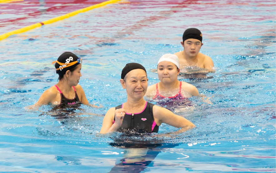『アクアビクス』とは水中で行うエアロビクスのことです。陸上で行うエアロビクスに比べ、関節への負担が少なく、膝・腰などに不安のある方も安心。